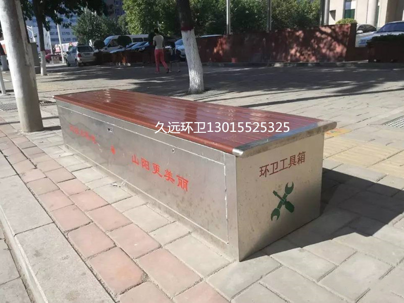 環(huán)衛(wèi)工具箱:也叫保潔員工具箱,環(huán)衛(wèi)工具椅,保潔員休息座椅,市政保潔箱等。工具箱常用尺寸為:長2400*寬500*高550mm,也可以做成2米,2.4米,2.7米等,寬度和高度也可以定做,滿足不同客戶、不同場所的使用要求。